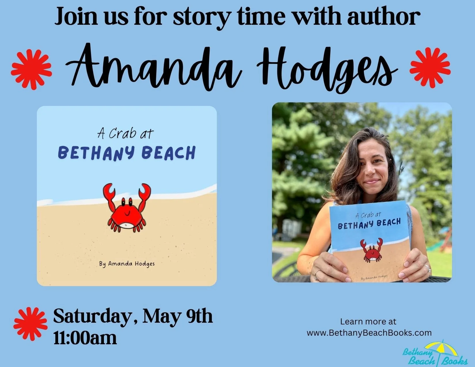 Join us for story time at Bethany Beach Books with author Amanda Hodges on Saturday, May 9th at 11am! Amanda will be reading her book A Crab at Bethany Beach ! Story time is free and open to children of all ages!